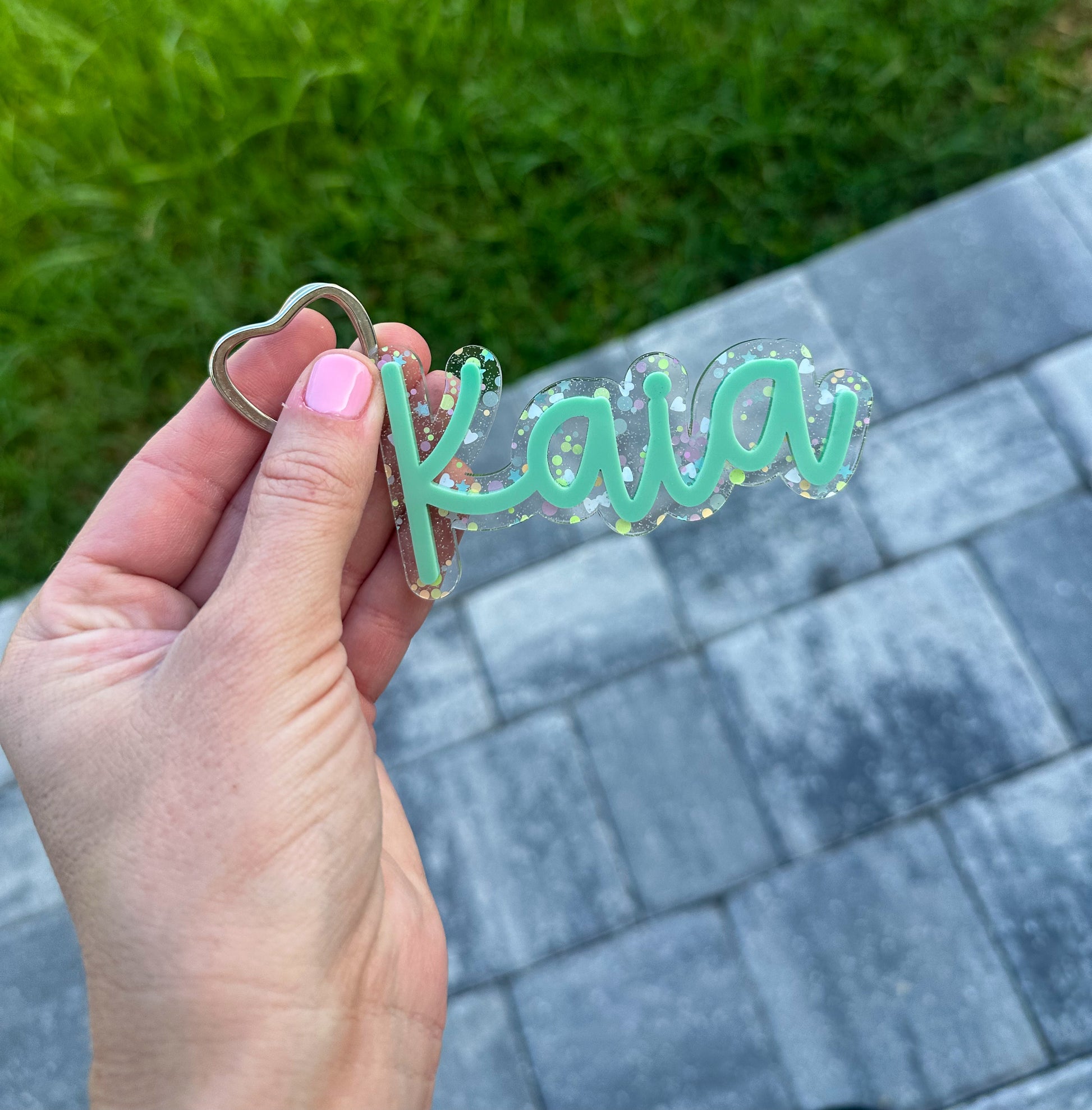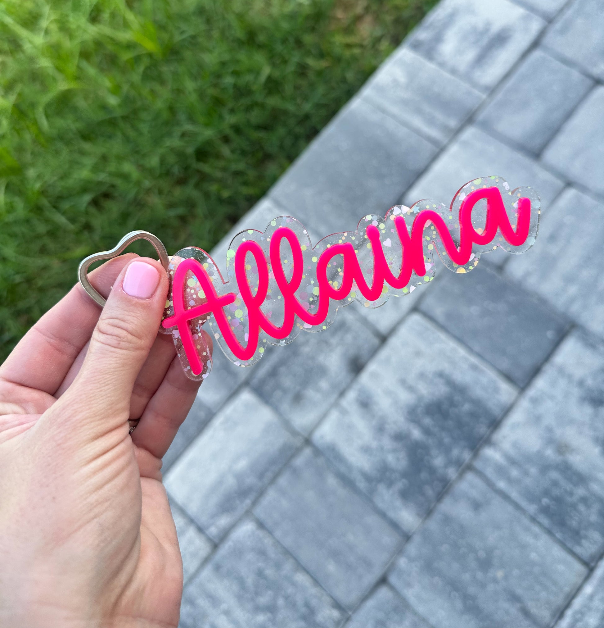 All keychain are cut from 1/8” acrylic and have a 1/8” acrylic name on top of the acrylic backer. Keychain is approximately 5” long.