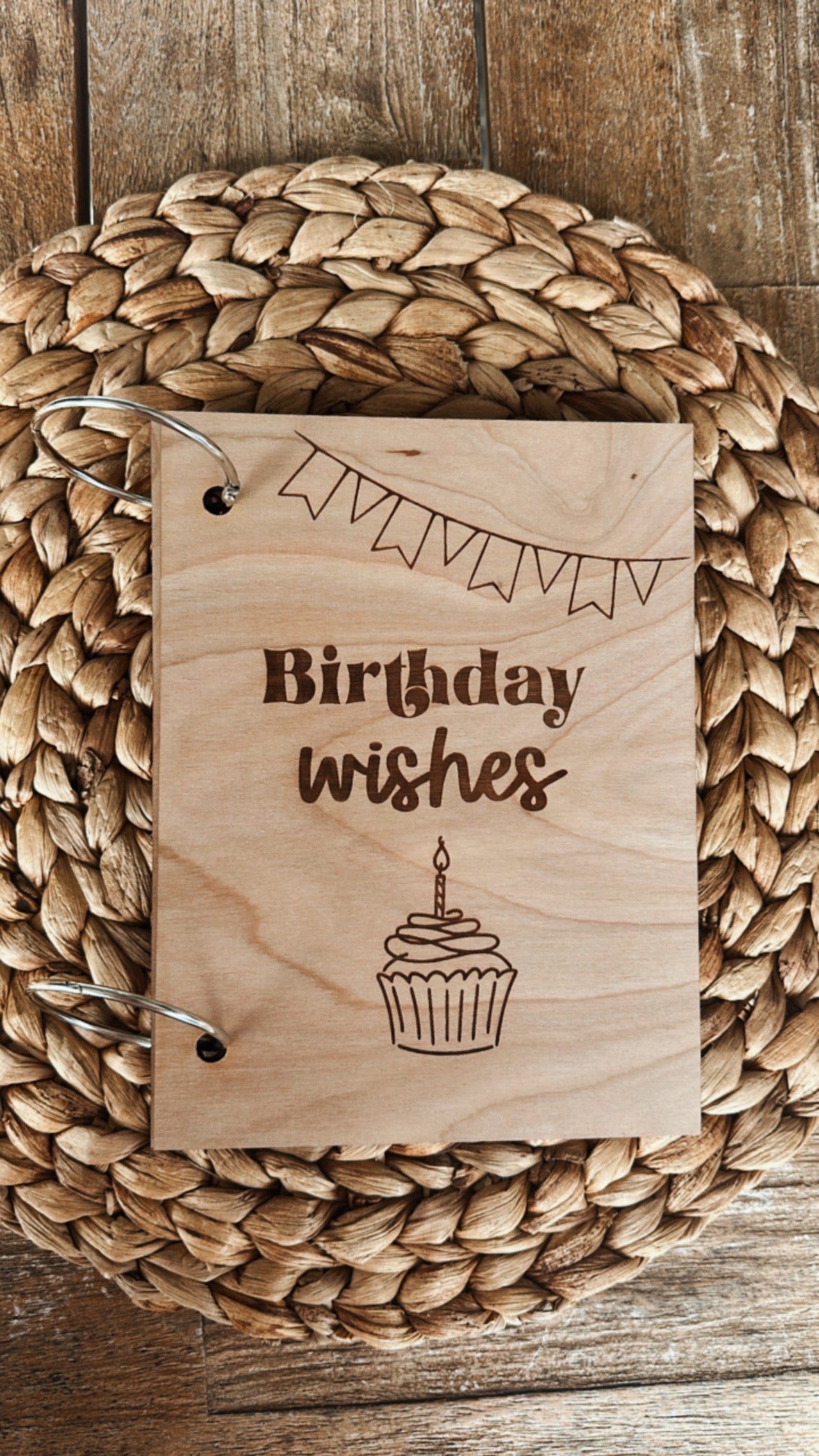 The card keepers are laser cut and engraved from a beautiful 1/8 wood. They are 6” by 8“ and have two metal rings that open to add plenty of cards! Each card keeper comes with 2 pieces of wood, and 2 metal rings.