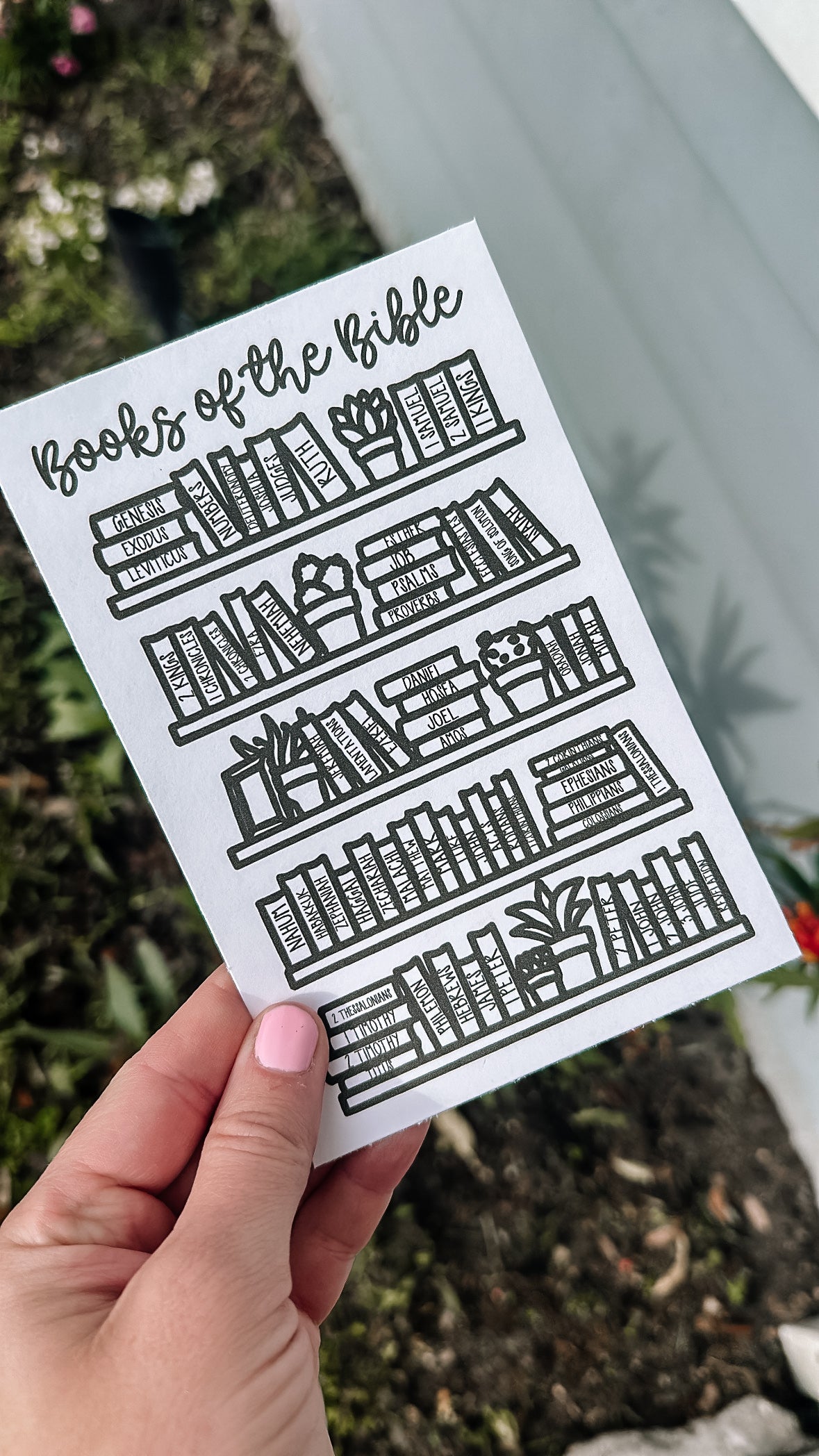 Now offering a Books of the Bible printed Sticker shipped directly to you. Each sticker is printed and cut approximately 4"x6" and ready to be placed into your bible. Color each book of the Bible once read.