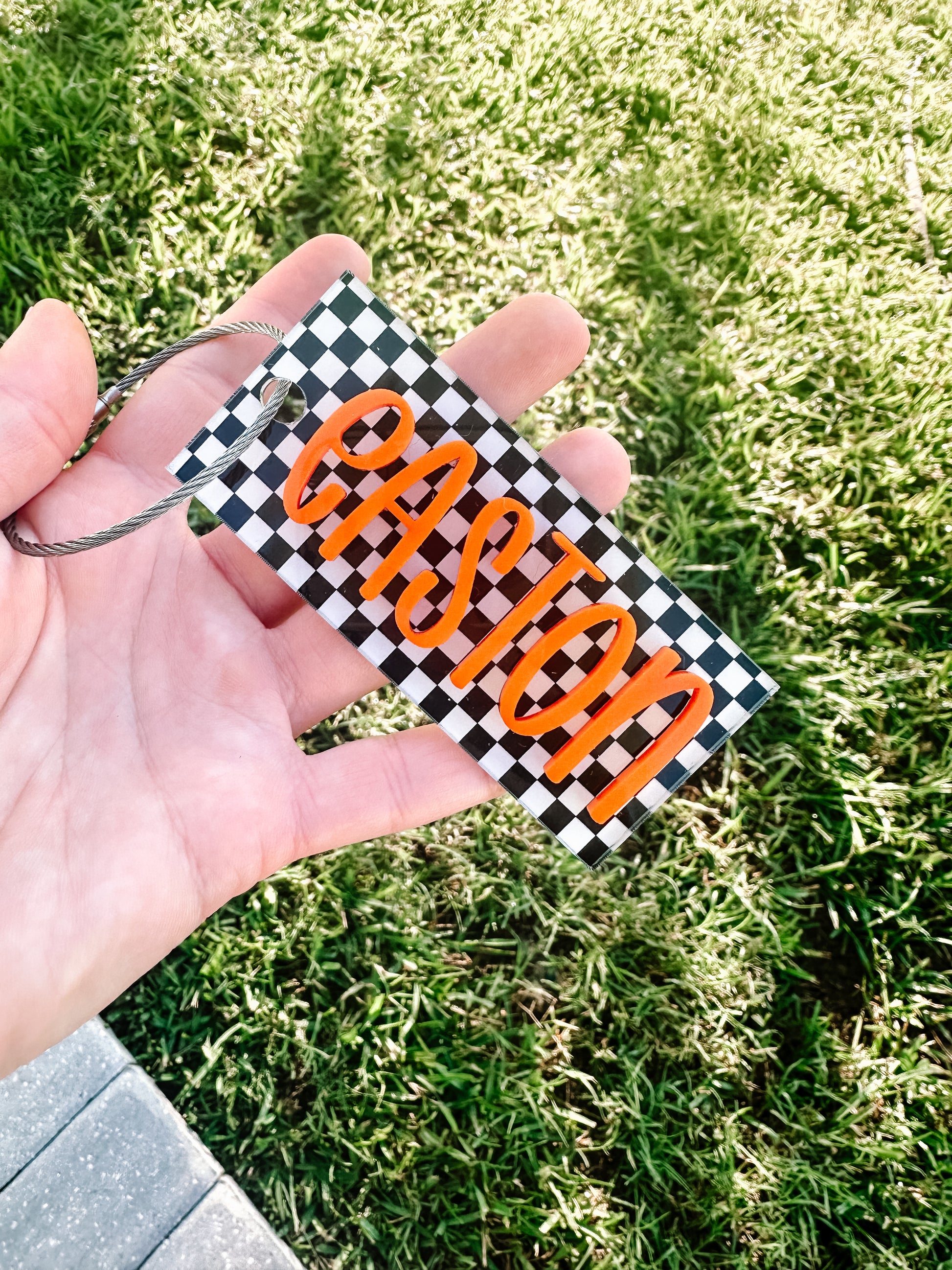 Checkered bag tags for your kiddos backpacks and bags. All tags are laser cut and engraved. Tags are made from a 1/8” checkered acrylic and with a 3d name. Bag tags are personalized with name.