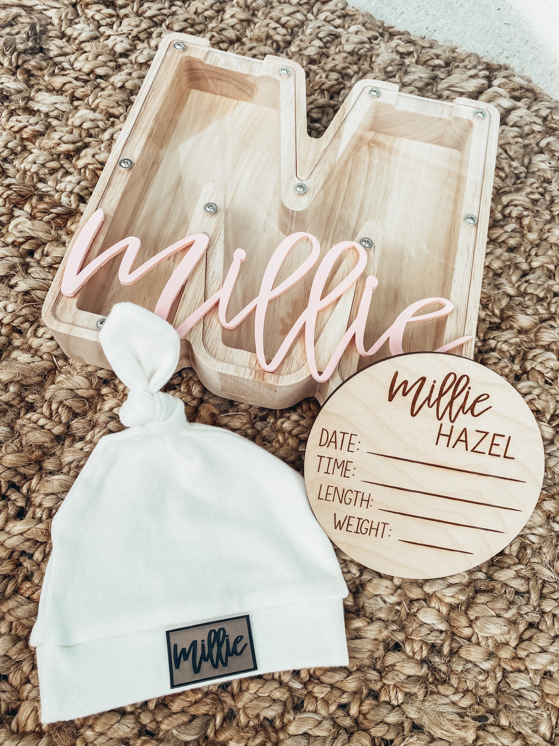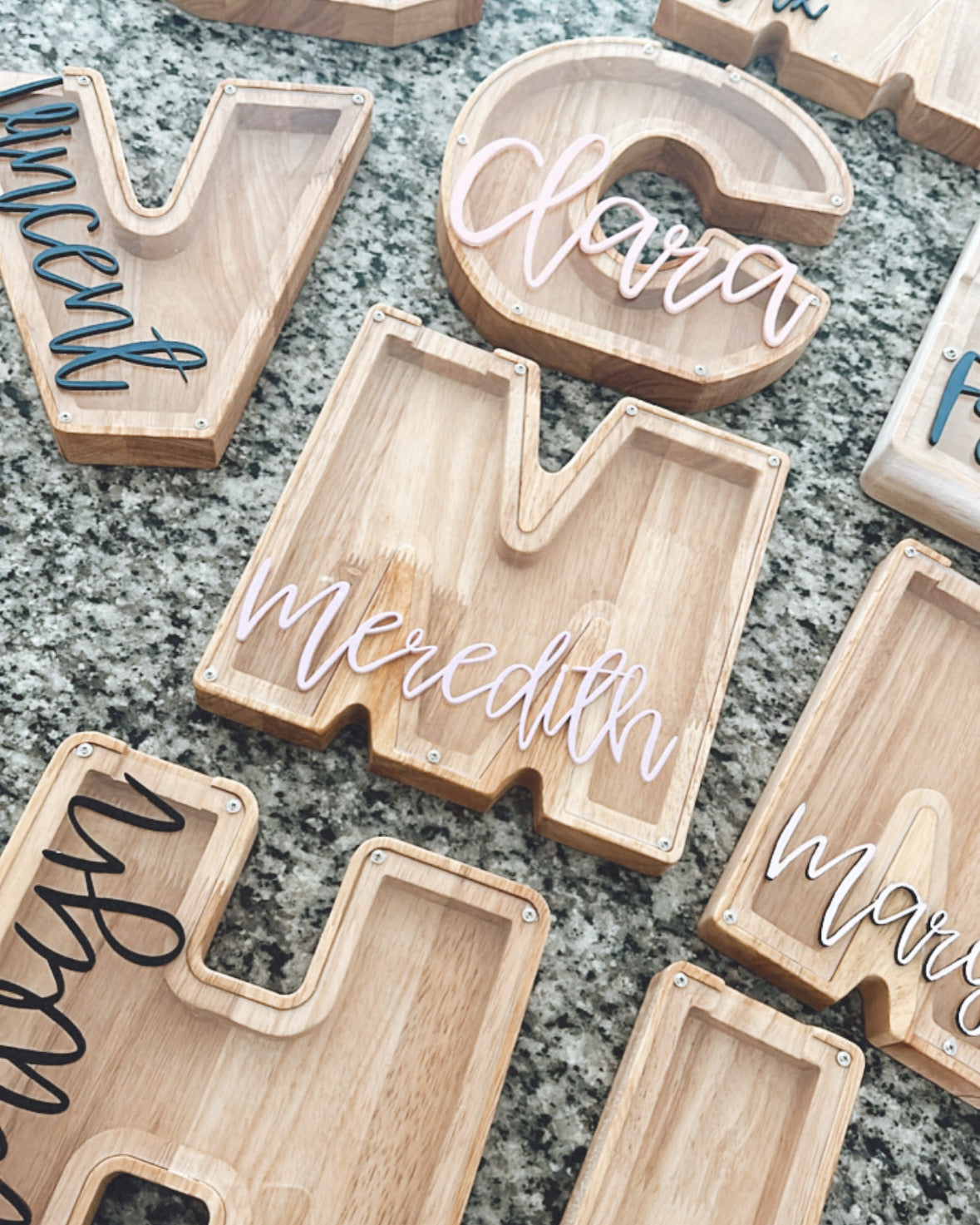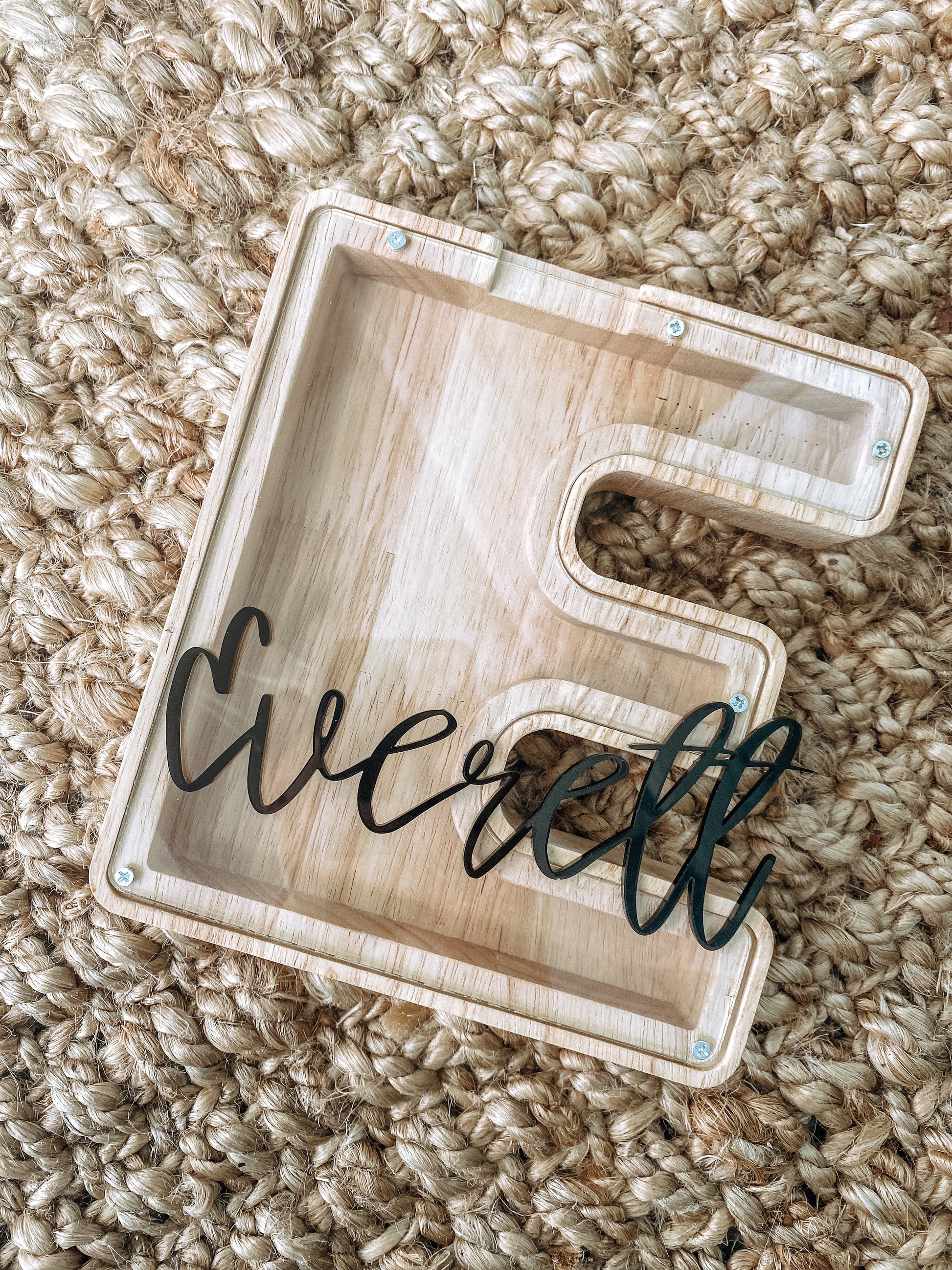Each personalized coin bank is made from wood and acrylic. The personalized name on the front in 3D is made from acrylic and your color of choice.