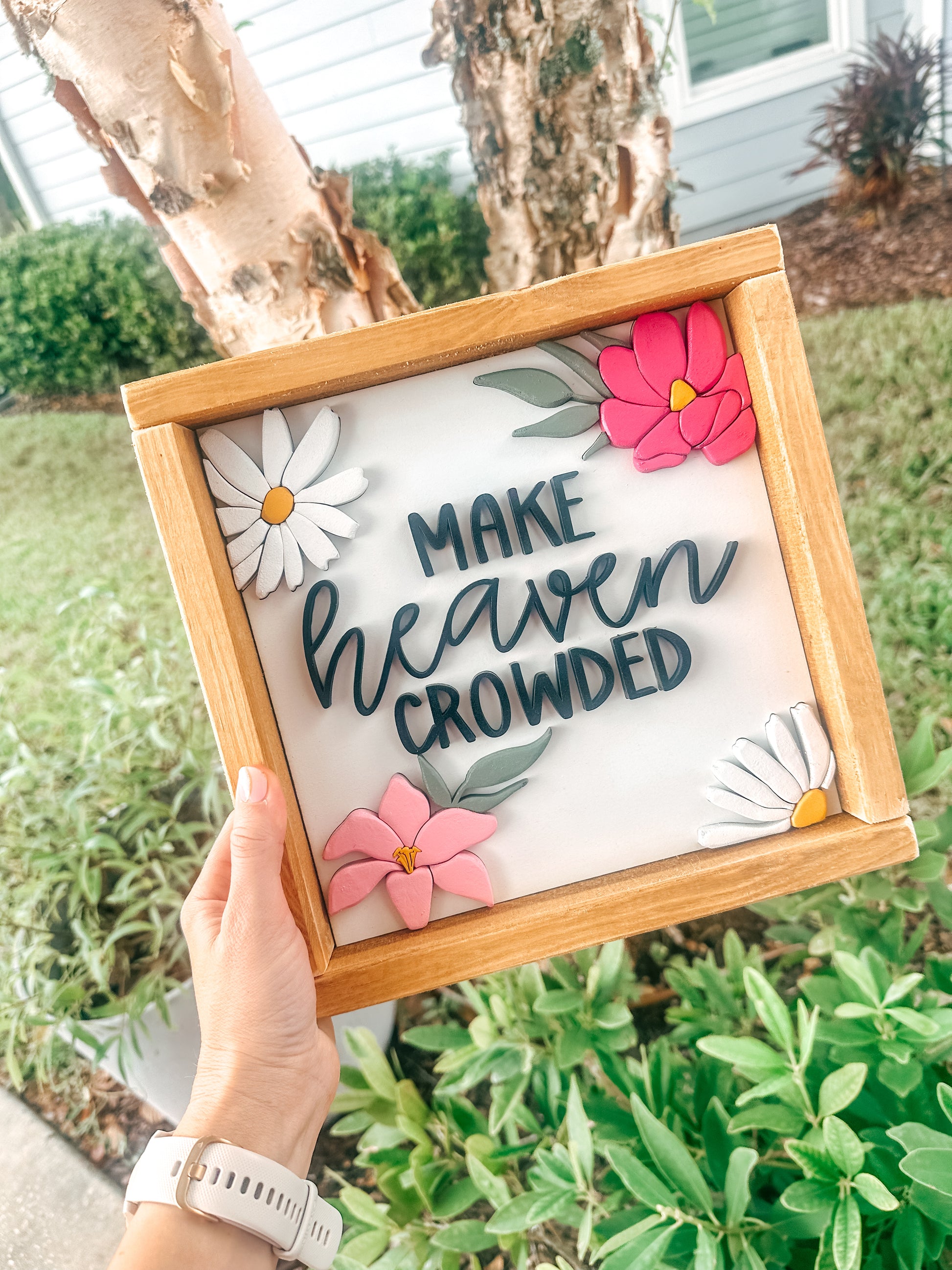This handmade “Make Heaven Crowded” sign is a faith-filled piece inspired by Matthew 28:19—“Go and make disciples of all nations.” These bold words and flowers hand-painted and sanded are surrounded by flowers, symbolizing the beauty of God’s creation and the flourishing of souls won for Christ.